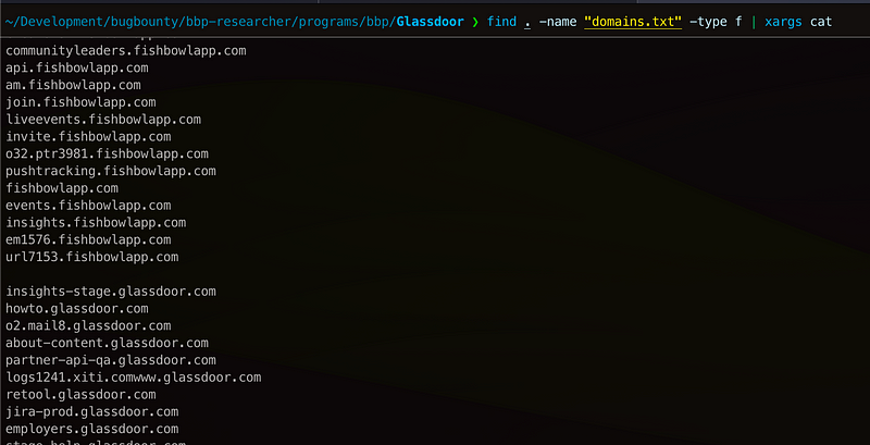 find . -name "domains.txt" -type f | xargs catNow that every program inside its own domain directory contains all the subdomains listed in domains.txt, you can effortlessly zoom in or out to a certain level.