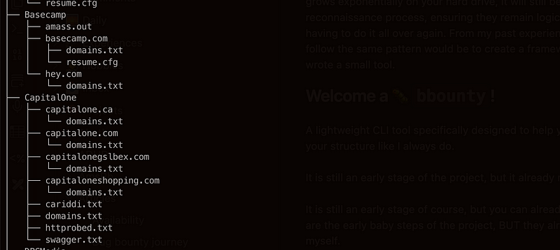 └── domains.txtThen, magically executes the subfinder -d %s — all | tee domains.txt command and creates domains.txt for you. With the recent changes, I have added support that lets you assign your own command in the ~/.config/bbounty/config.yml. So no need to think I didn’t think of you! Now you can change it to whatever command you like. For that by the way, I wouldn’t mind you like the article and this CLI tool on Github.
